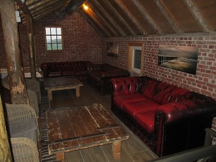 Verder is er een gezellige zithoek met Chesterfield banken. De salontafels zijn gemaakt van de oude staldeuren, waar eens de twee werkpaarden achter stonden. Het ijzeren beslag hebben we op deze tafels laten zitten om zo de herinnering aan de vroegere bestemming van de accommodatie levend te houden.